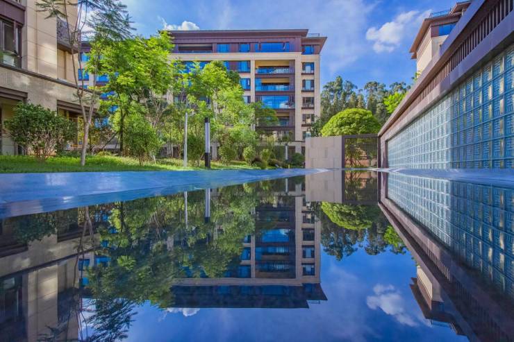 二境:镜水拂影,长亭映凤。社区水景观与迎宾广场相呼应,水面倒映云天,回廊、水岸、花木相交织,构筑出东方优雅的归家仪式感。