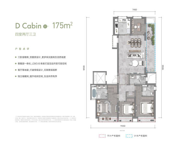 LDKS-B餐客厨一体化,空间舒阔,功能多变;大层高、大面宽、大进深阳台,生活无界;独立收纳储藏间。