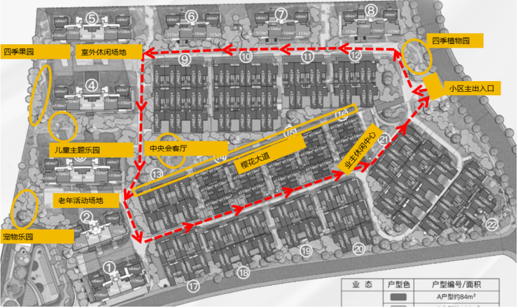 ①一轴是我们中央主景观的樱花大道景观轴,从小区主入口(9#楼南侧景观区,4#楼南侧景观区)串联起来中央景观轴,让您体验四季有花、常年有景的四季绿景系统,一环是我们小区健康跑道,链接着小区整个景观资源,同时打造五大场景与其相呼应,给业主带来多元化的生活体验场景。