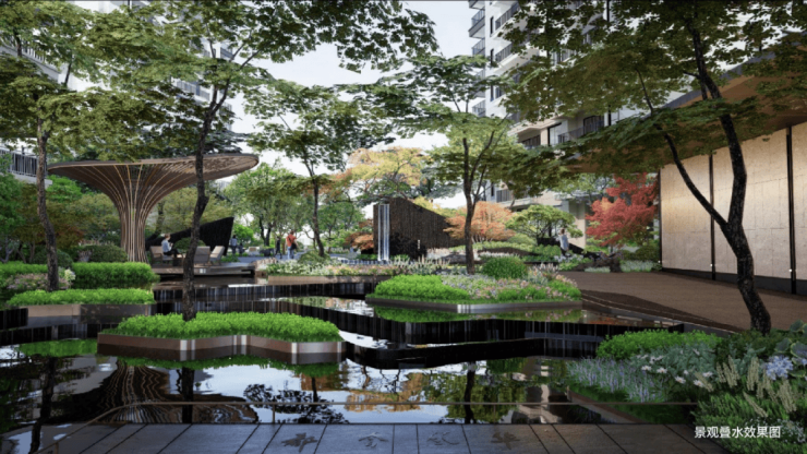 景观叠水:水流顺着错落有致的石阶层级而下,与水景相互映衬,营造出清新灵动的氛围