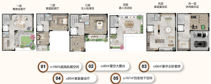 ⑤宅为崇:打造以组团空间为基础的邻里回归,3合院、4合院、8合院,多居住形态,居住尺度符合现代人居理念,高附加值可变空间,地下两层、庭院、露台超高赠送。