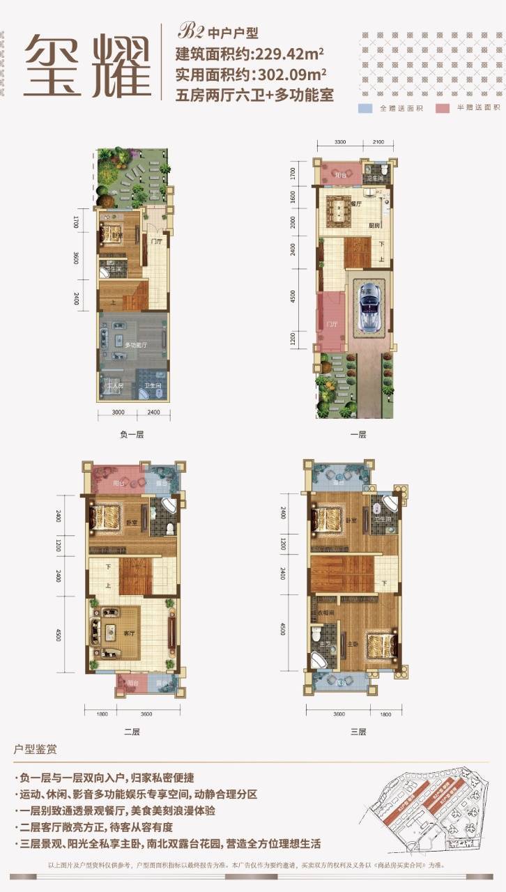地块开发建设有52栋、196套法式主题别墅,由176套联排和20套双拼产品组成;联排产品以四联排为主,地下1层地上3层,带有前后花园和车库,四联排主力户型面积229、249㎡;双拼户型面积291㎡。产品除了前后花园外,带有电梯入户,同样是地下1层地上3层的结构。