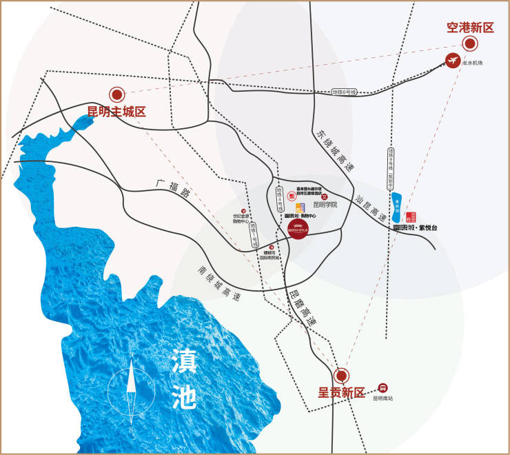 项目毗邻30万㎡富康城昆明经开中心(包含写字楼、购物中心及国内首家万豪双品牌五星级酒店——喜来登&德尔塔酒店),是云南自贸区昆明片区首个大型城市综合体;同时,项目毗邻螺蛳湾商圈、新亚洲商圈、世纪城商圈、大都摩天商圈,五大醇熟商圈环伺,繁华生活无需等待。