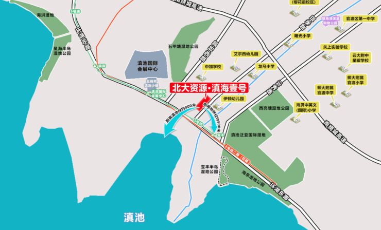 项目位于昆明会展片区,整个片区以“飞虎大道”为中轴,往北承接巫家坝机场片区延伸至广福路,南至滇池沿岸,西至星海半岛西侧,东至宝丰半岛东侧,整体地势开阔平整,是昆明市主城区稀缺的可完整连片开发区域。同时片区毗邻滇池、远眺西山,多个湿地公园萦绕,自然景观生态资源丰富,且片区内多为低密度项目,整体宜居度在昆明首屈一指。