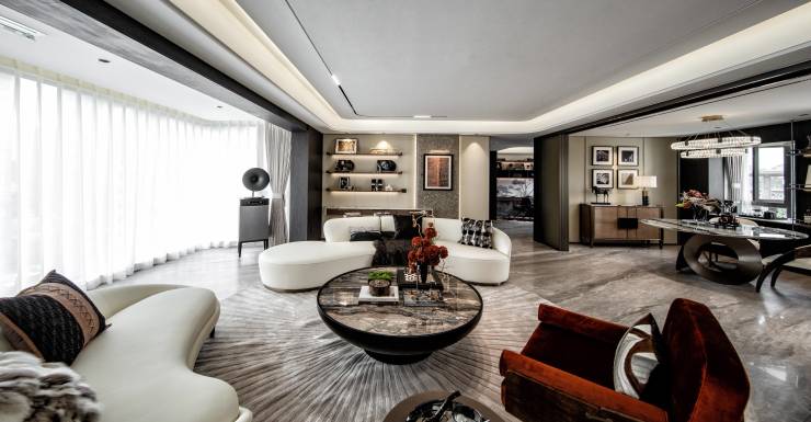 高定选材:上万元/m²纯天然冷翡翠吧台背景,超12万元打造超白玻工艺会客区,土耳其云朵拉灰进口天然石材外立面