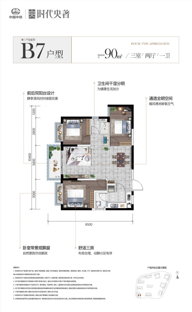 二期在售:83㎡(三房一卫)、95/99㎡(三房双卫)、108㎡(三房双卫)、129㎡(四房双卫)