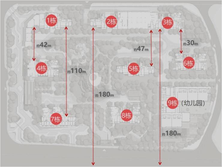 超大楼间距,最大约180米楼间距:更奢阔的视野,更私密的居住体验,更好的采光,更好的日照。
