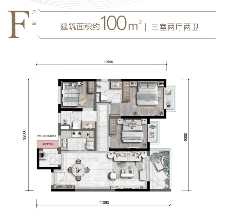 空间升级:双阳台设计、92-102m²X百变可拓展空间、可做功能阳台&卫浴、2.4米入户门(比行业标准高20cm)