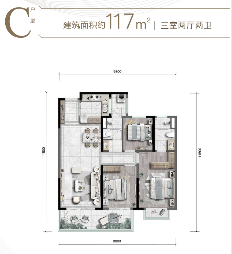 空间升级:双阳台设计、92-102m²X百变可拓展空间、可做功能阳台&卫浴、2.4米入户门(比行业标准高20cm)