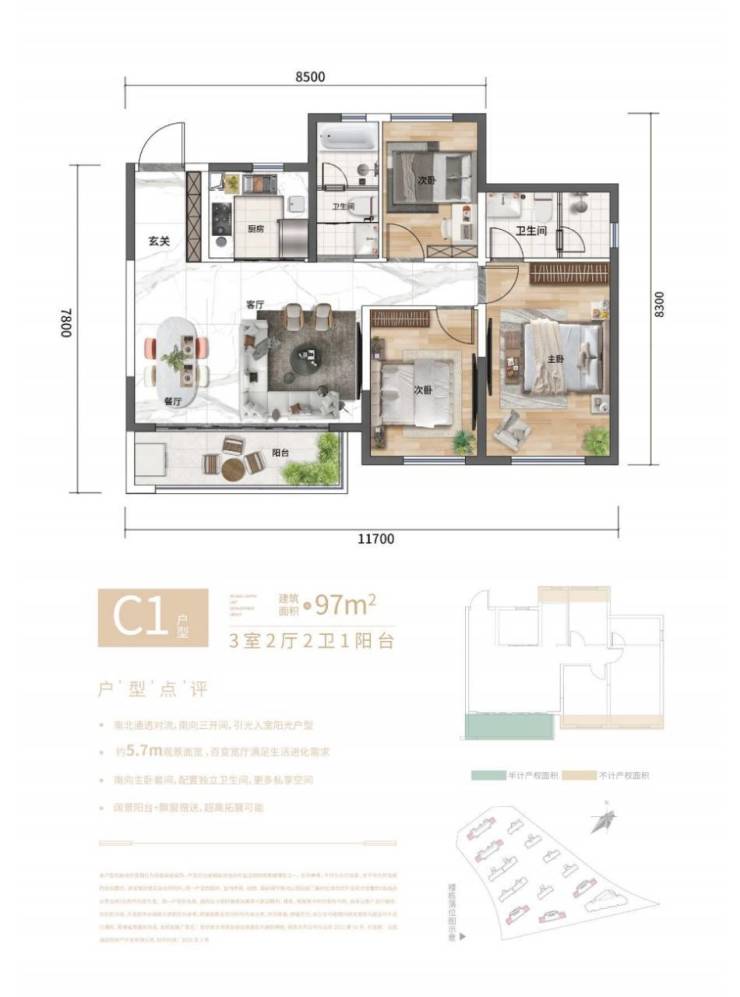 建筑面积约97㎡,三室两厅两卫一阳台