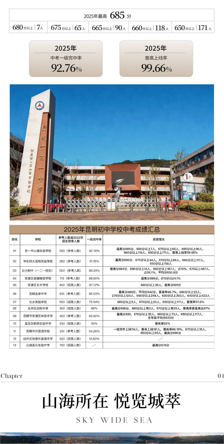 学校传承昆一中教育理念及雄厚资源,是九年一贯制公立学府,2025年中考一级完中率92.76%,全市排名TOP1,普⾼上线率99.66%。