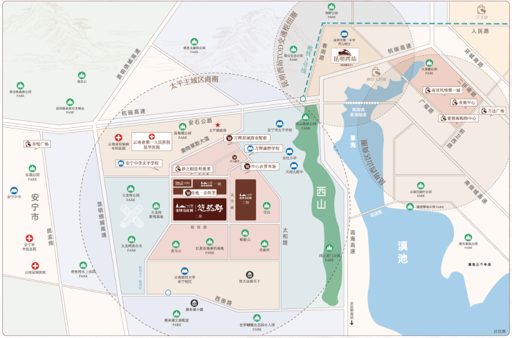 休闲:驱车半小时内,即可达光崀文艺村、玉龙湾公园、青鱼湾水上乐园、蝴蝶谷小人国以及安宁地热温泉群、西山、滇池大坝等昆明重点风景区,给您和家人的周末休闲带去众多的选择。