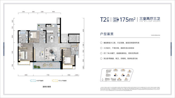 1、国际一线装标:采用杜拉维特、汉斯格雅等国际一线装标,配备全屋中央空调,装修标准达3000元/㎡