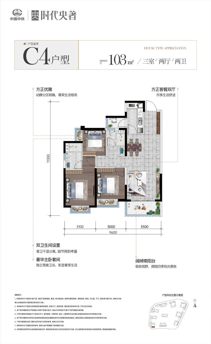 二期在售:83㎡(三房一卫)、95/99㎡(三房双卫)、108㎡(三房双卫)、129㎡(四房双卫)