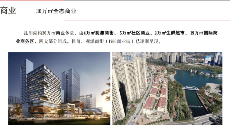 项目周边的商业,7公里内直达同德-白云路商圈;北辰商圈;霖雨桥商圈;和谐世纪商圈;爱琴海商圈;满足您和家人“一站购物、一站休闲、一站娱乐”的都会生活方式。同时昆明湖配有30万方的综合性商业。沿龙江西路非是常有特色的临瀑西班牙风情商业街,叫“云瀑天街”,因为这边临着瀑布公园、盘龙江,所以这一排商墅规划的是以观景、休闲、养生、娱乐为主的业态,比如酒吧、主题餐饮、茶室、健身房、spa会所等等。目前我们招商部已经积极的在对接商家,大部分商家已经开街。