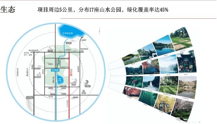 北部山水新城规划绿地424.94公顷,公共绿地205.38公顷,借助山水的自然优势,将建设成为昆明最大的城市公园群落。除了亚洲最大的瀑布景观生态公园(480亩)外,本项目5公里范围内有银杏公园、田溪公园、金羊公园、春江公园、春溢公园、龙川桥公园、春晓公园、金江公园、春漫公园、竹源公园等十七大公园;